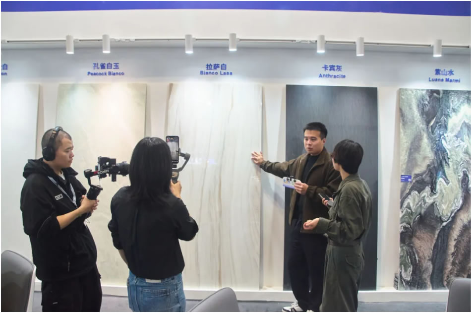 ? ? ? ? 展位前,澳磊團(tuán)隊與前來咨詢的客商熱切交流。團(tuán)隊通過移動端可視化平臺,細(xì)致呈現(xiàn)每一款產(chǎn)品的應(yīng)用場景與工藝細(xì)節(jié),從拉薩白的建筑肌理到拼花的設(shè)計演變,指尖滑動間,石材的無限可能躍然眼前。無論是技術(shù)參數(shù)還是個性化方案,團(tuán)隊人員均給予專業(yè)而深入的解答,讓到訪客商直觀感受澳磊三十余載品牌的匠心沉淀與服務(wù)溫度。